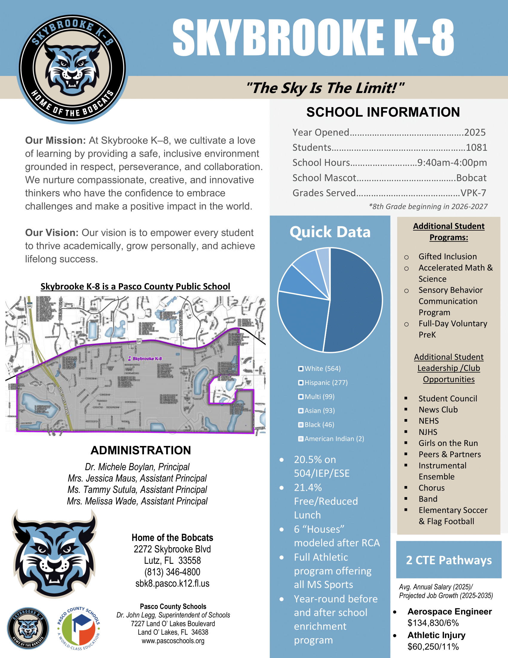 Click Here to enter your home address and find your Elementary, Middle, and High school attendance zone. If this is not Skybrooke K-8 and you wish to enroll with us, you will have to follow the Pasco Pathways School Choice procedures found on this website.